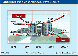 2. Insolvenzen und ihre Ursachen 2.1 Insolvenzen Mit einem Wachstum von 25,2% auf insgesamt 18800 waren die Insolvenzfälle in Deutschland im 1.Halbjahr 2002 zu registrieren. In Westdeutschland waren es 13600 und in Ostdeutschland 5.200 Unternehmen, wie die nachstehende Grafik zeigt.